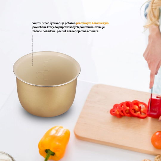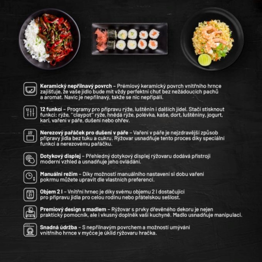 Užite si viac času na iné aktivity a varenie zverte multifunkčnému rýžovaru, ktorého 12 prednastavených programov si poradí s prípravou rôznych jedál. Programy ako ryža, "claypot" ryža, hnedá ryža, polievka, kaša, dort, strukoviny, jogurt, kari, varenie v pare, dusenie či ohrev sú zárukou jednoduchého a rýchleho varenia. Prémiový keramický povrch vnútorného hrnca navyše neuvoľňuje žiadnu nežiaducu pachuť ani arómu, príprava jedál je tak zdravšia. Ak chcete svoj životný štýl ešte zdokonaliť, využite nerezového parníka na dusenie v pare.