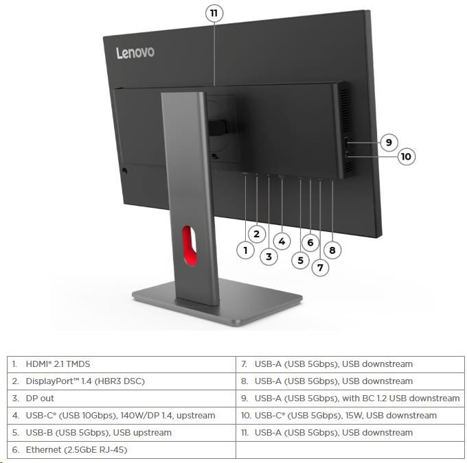 | Špeciálne funkcie | Factory Calibration: Priemerné Delta E, Picture In Picture (PIP) / Podpora Picture By Picture (PBP) Podpora Lenovo ThinkColour (Lenovo Accessories and Display Manager) Lenovo ThinkColour podporuje Windows 10 & 11, Mac OS (funkcie sa líšia podľa systému). Lenovo Accessories and Display Manager je predtým Lenovo Display Control Center. KVM prepínač (s eKVM) LDFM (Lenovo Display Fleet Manager) Mriežková tlačidlo na zapnutie Multi-sync Prírodné Low Blue Light Smart Power Funkcia Smart Power inteligentne deteguje celkovú spotrebu energie a dynamicky riadi dodávku energie pre každý zariadenie |