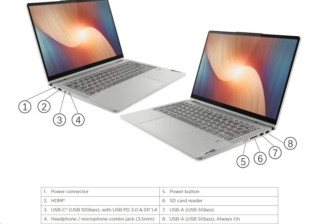 | Standartné porty | 1x USB-A (USB 5Gbps / USB 3.2 Gen 1), Always On 1x USB-C® (USB 10Gbps / USB 3.2 Gen 2), with USB PD 3.0 and DisplayPort™ 1.4 1x USB-A (USB 5Gbps / USB 3.2 Gen 1) 1x HDMI® 1.4b 1x SD card reader 1x Headphone / microphone combo jack (3.5mm) 1x Power connector |