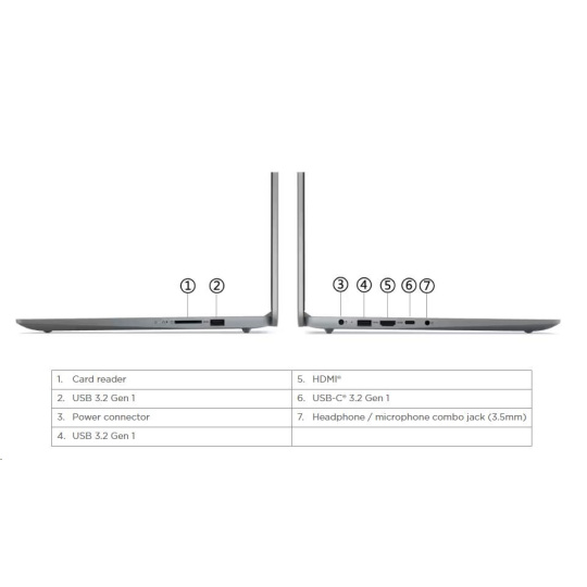 | Standartné porty | 2x USB 3.2 Gen 1 1x USB-C® 3.2 Gen 1 (support data transfer, Power Delivery and DisplayPort™ 1.2) 1x HDMI® 1.4 1x Headphone / microphone combo jack (3.5mm) 1x Card reader 1x Power connector  |