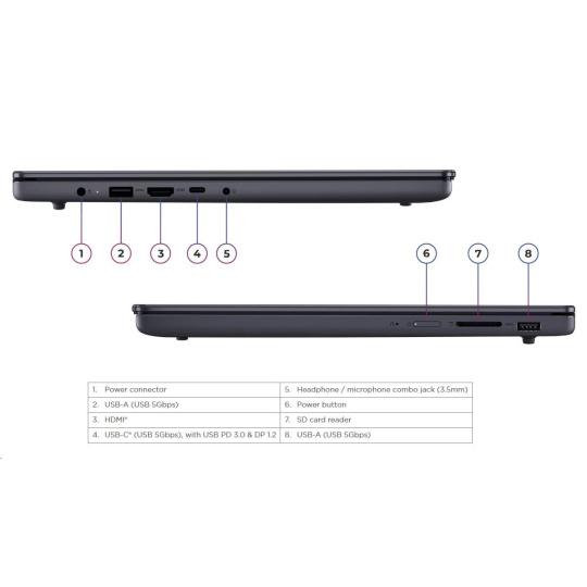 | Standartné porty | 2x USB-A (USB 5Gbps / USB 3.2 Gen 1) 1x USB-C® (USB 5Gbps / USB 3.2 Gen 1), with USB PD 3.0 and DisplayPort™ 1.2 1x HDMI® 1.4 1x Headphone / microphone combo jack (3.5mm) 1x SD card reader 1x Power connector |