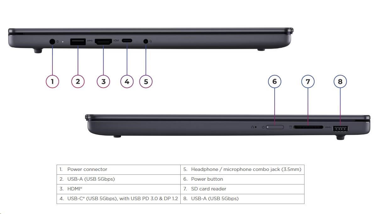 | Standartné porty | 2x USB-A (USB 5Gbps / USB 3.2 Gen 1) 1x USB-C® (USB 5Gbps / USB 3.2 Gen 1), with USB PD 3.0 and DisplayPort™ 1.2 1x HDMI® 1.4 1x Headphone / microphone combo jack (3.5mm) 1x SD card reader 1x Power connector |