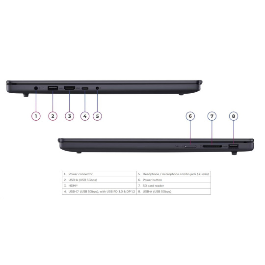 | Standartné porty | 2x USB-A (USB 5Gbps / USB 3.2 Gen 1) 1x USB-C® (USB 5Gbps / USB 3.2 Gen 1), with USB PD 3.0 and DisplayPort™ 1.2 1x HDMI® 1.4 1x Headphone / microphone combo jack (3.5mm) 1x SD card reader 1x Power connector |