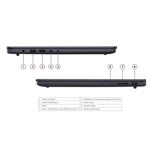 | Standartné porty | 2x USB-A (USB 5Gbps / USB 3.2 Gen 1) 1x USB-C® (USB 5Gbps / USB 3.2 Gen 1), with USB PD 45-65W and DisplayPort™ 1.2 1x HDMI® 1.4 1x Headphone / microphone combo jack (3.5mm) 1x SD card reader 1x Round tip power connector |
