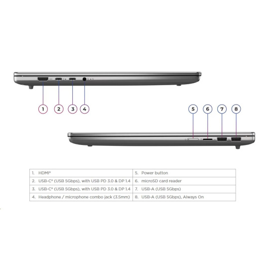 | Standartné porty | 1x USB-A (USB 5Gbps / USB 3.2 Gen 1) 1x USB-A (USB 5Gbps / USB 3.2 Gen 1), Always On 2x USB-C® (USB 5Gbps / USB 3.2 Gen 1), with USB PD 3.0 and DisplayPort™ 1.4 1x HDMI® 2.1, up to 4K/60Hz 1x Headphone / microphone combo jack (3.5mm) 1x microSD card reader |