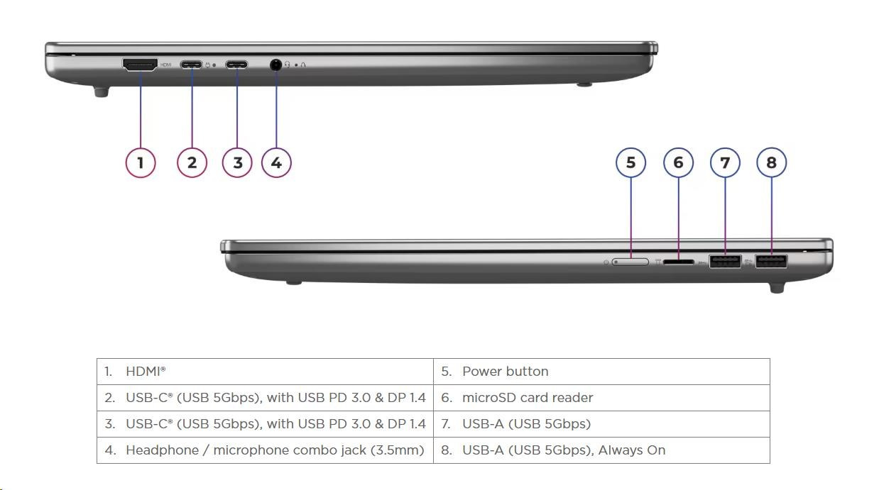 | Standartné porty | 1x USB-A (USB 5Gbps / USB 3.2 Gen 1) 1x USB-A (USB 5Gbps / USB 3.2 Gen 1), Always On 2x USB-C® (USB 5Gbps / USB 3.2 Gen 1), with USB PD 3.0 and DisplayPort™ 1.4 1x HDMI® 2.1, up to 4K/60Hz 1x Headphone / microphone combo jack (3.5mm) 1x microSD card reader |