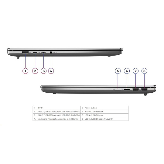 | Standartné porty | 1x USB-A (USB 5Gbps), Always On 1x USB-A (USB 5Gbps) 2x USB-C® (USB 10Gbps), with USB PD 3.0 and DisplayPort™ 1.4 1x HDMI® 2.1, up to 4K/60Hz 1x Headphone / microphone combo jack (3.5mm) 1x microSD card reader |