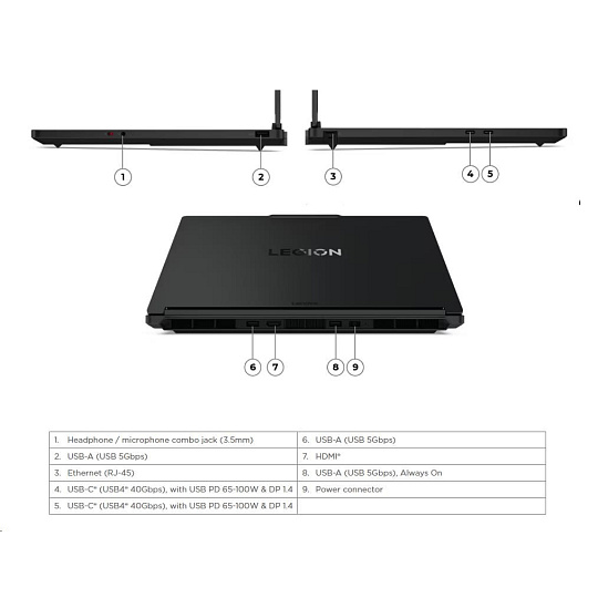 | Standartné porty | 2x USB-A (USB 5Gbps) 1x USB-A (USB 5Gbps), Always On 2x USB-C® (USB4® 40Gbps), with USB PD 65-100W and DisplayPort™ 1.4 1x HDMI® 2.1, up to 8K/60Hz 1x Headphone / microphone combo jack (3.5mm) 1x Ethernet (RJ-45) 1x Slim tip Power connector |