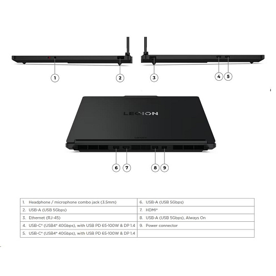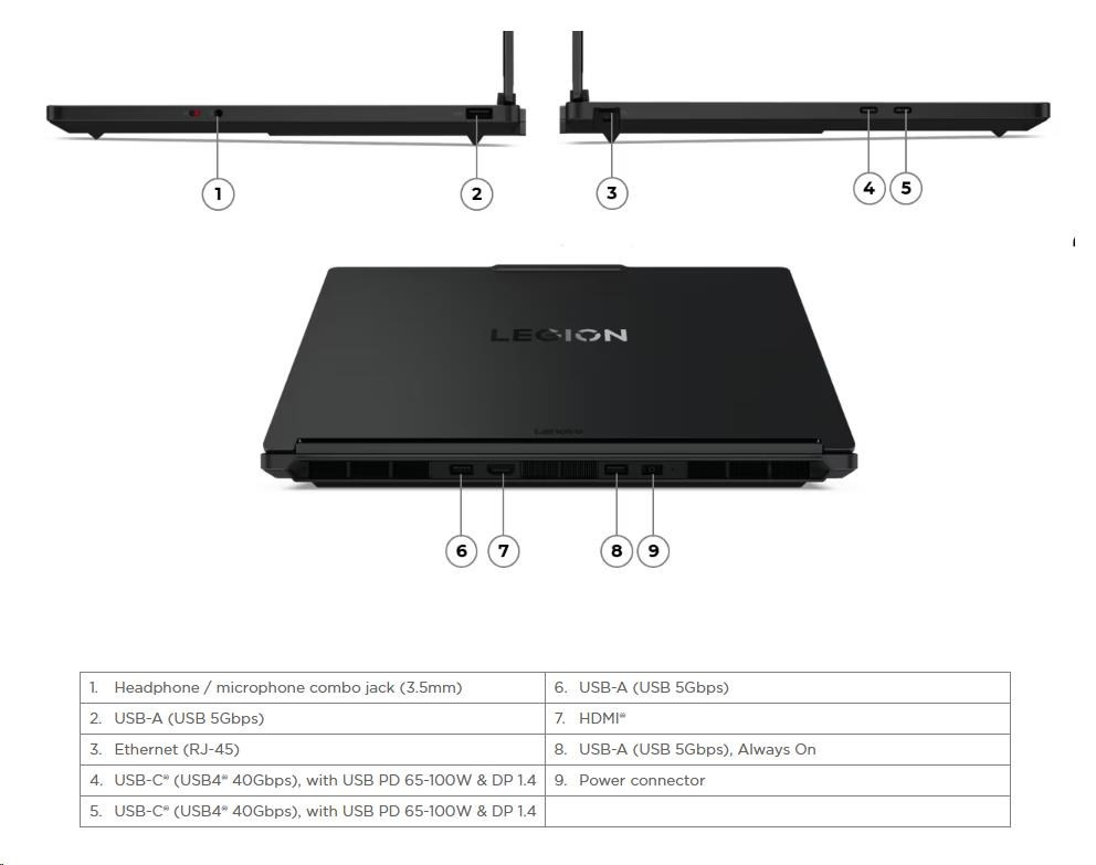 | Standartné porty | 2x USB-A (USB 5Gbps) 1x USB-A (USB 5Gbps), Always On 2x USB-C® (USB4® 40Gbps), with USB PD 65-100W and DisplayPort™ 1.4 1x HDMI® 2.1, up to 8K/60Hz 1x Headphone / microphone combo jack (3.5mm) 1x Ethernet (RJ-45) 1x Slim tip Power connector |