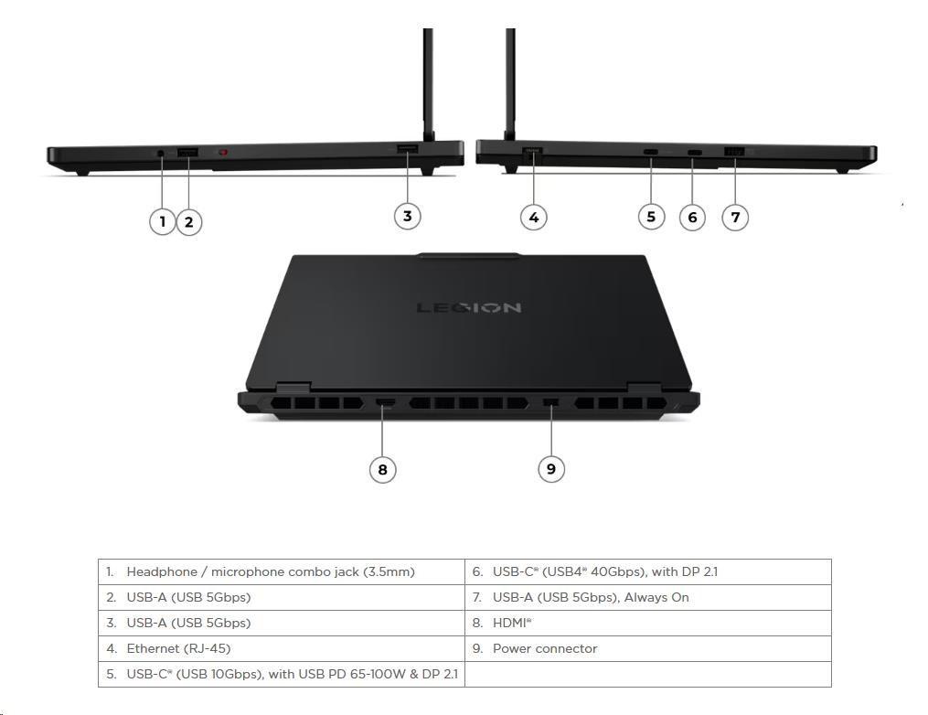 | Standartné porty | 2x USB-A (USB 5Gbps / USB 3.2 Gen 1) 1x USB-A (USB 5Gbps / USB 3.2 Gen 1), Always On 1x USB-C® (USB 10Gbps / USB 3.2 Gen 2), with USB PD 65-100W and DisplayPort™ 2.1 1x USB-C® (USB4® 40Gbps), with DP 2.1 1x HDMI® 2.1, up to 8K/60Hz 1x Headphone / microphone combo jack (3.5mm) 1x Ethernet (RJ-45) 1x Power connector |