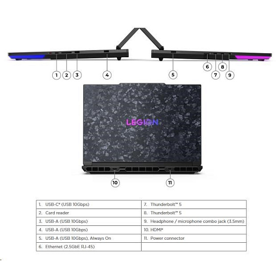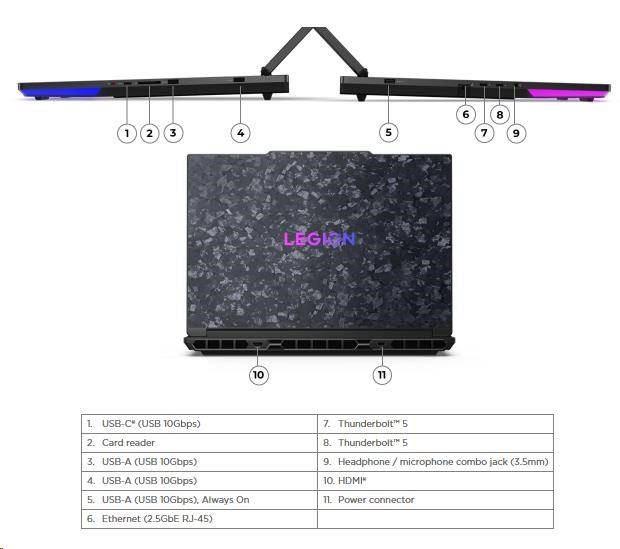 | Standartné porty | 2x USB-A (USB 10Gbps / USB 3.2 Gen 2) 1x USB-A (USB 10Gbps / USB 3.2 Gen 2), Always On 1x USB-C® (USB 10Gbps / USB 3.2 Gen 2) 2x Thunderbolt™ 5, with USB PD 95-100W and DisplayPort™ 2.1 1x HDMI® 2.1, up to 8K/60Hz 1x Headphone / microphone combo jack (3.5mm) 1x Ethernet (2.5GbE RJ-45) 1x Card reader 1x Slim tip Power connector |