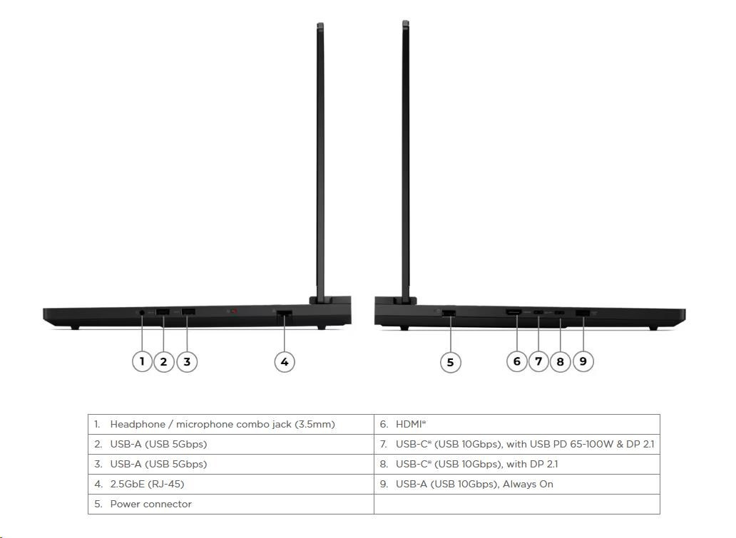 | Standartné porty | 2x USB-A (USB 5Gbps / USB 3.2 Gen 1) 1x USB-A (USB 10Gbps / USB 3.2 Gen 2), Always On 1x USB-C® (USB 10Gbps / USB 3.2 Gen 2), with DisplayPort™ 2.1 1x USB-C® (USB 10Gbps / USB 3.2 Gen 2), with USB PD 65-100W and DisplayPort™ 2.1 1x HDMI® 2.1, up to 8K/60Hz 1x Headphone / microphone combo jack (3.5mm) 1x Ethernet (2.5GbE RJ-45) 1x Power connector |