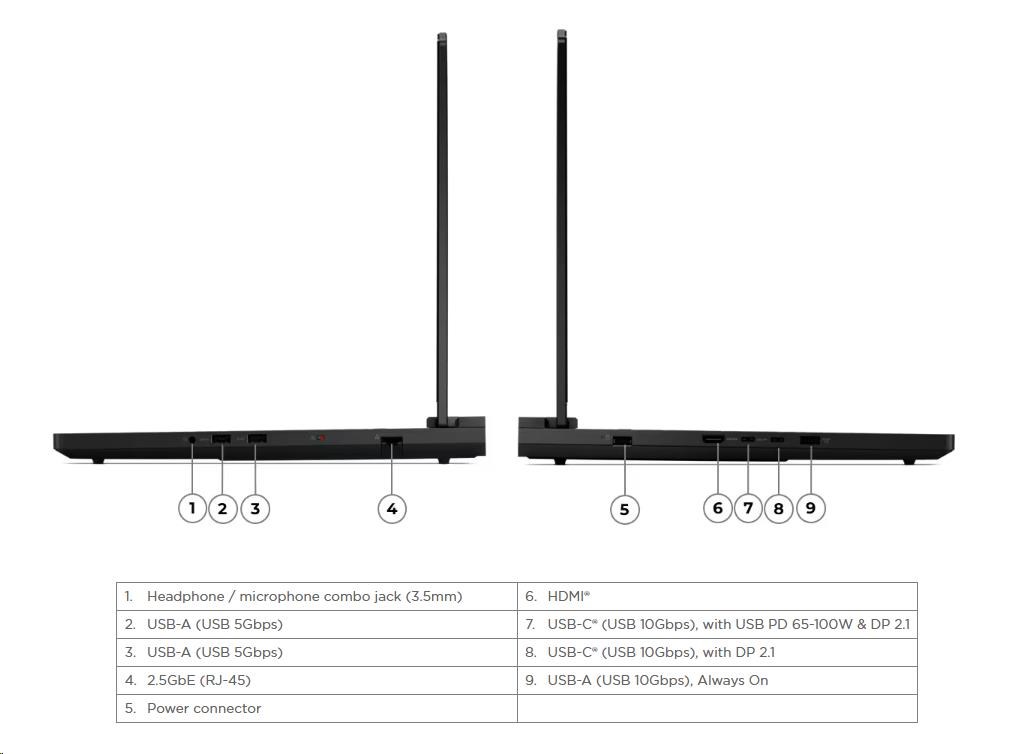 Standartné porty | 2x USB-A (USB 5Gbps / USB 3.2 Gen 1) 1x USB-A (USB 10Gbps / USB 3.2 Gen 2), Always On 1x USB-C® (USB 10Gbps / USB 3.2 Gen 2), with DisplayPort™ 2.1 1x USB-C® (USB 10Gbps / USB 3.2 Gen 2), with USB PD 65-100W and DisplayPort™ 2.1 1x HDMI® 2.1, up to 8K/60Hz 1x Headphone / microphone combo jack (3.5mm) 1x Ethernet (2.5GbE RJ-45) 1x Power connector |