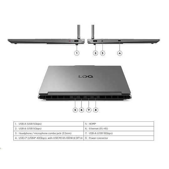 | Standartné porty | 2x USB-A (USB 5Gbps) 1x USB-A (USB 10Gbps) 1x USB-C® (USB4® 40Gbps), with USB PD 65-100W and DisplayPort™ 1.4 1x HDMI® 2.1, up to 8K/60Hz 1x Headphone / microphone combo jack (3.5mm) 1x Ethernet (RJ-45) 1x Slim tip Power connector |