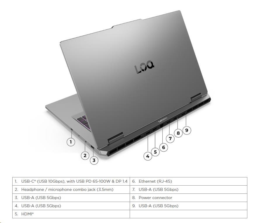 | Standartné porty | 4x USB-A (USB 5Gbps / USB 3.2 Gen 1) 1x USB-C® (USB 10Gbps / USB 3.2 Gen 2), with USB PD 65-100W and DisplayPort™ 1.4 1x HDMI® 2.1, up to 8K/60Hz 1x Headphone / microphone combo jack (3.5mm) 1x Ethernet (RJ-45) 1x Power connector |