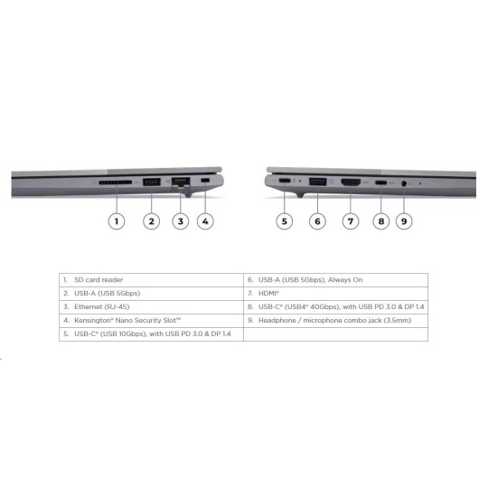 | Standartné porty | 1x USB-A (USB 5Gbps / USB 3.2 Gen 1) 1x USB-A (USB 5Gbps / USB 3.2 Gen 1), Always On 1x USB-C® (USB 10Gbps / USB 3.2 Gen 2), with USB PD 3.0 and DisplayPort™ 1.4 1x USB-C® (USB4® 40Gbps), with USB PD 3.0 and DisplayPort™ 1.4 1x HDMI® 2.1, up to 4K/60Hz 1x Headphone / microphone combo jack (3.5mm) 1x Ethernet (RJ-45) 1x SD card reader  |