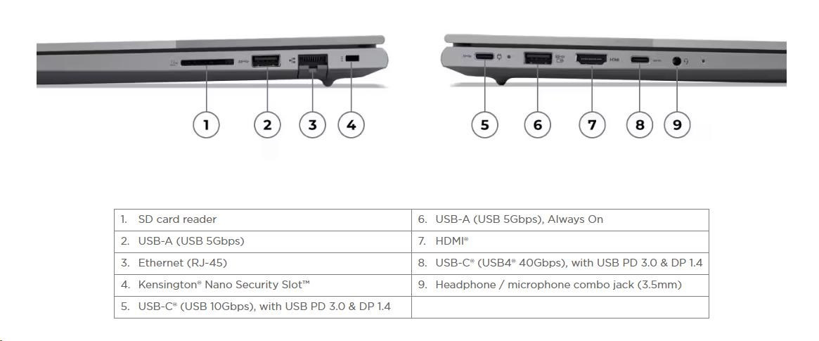 Standartné porty | 1x USB-A (USB 5Gbps / USB 3.2 Gen 1) 1x USB-A (USB 5Gbps / USB 3.2 Gen 1), Always On 1x USB-C® (USB 10Gbps / USB 3.2 Gen 2), with USB PD 3.0 and DisplayPort™ 1.4 1x USB-C® (USB4® 40Gbps), with USB PD 3.0 and DisplayPort™ 1.4 1x HDMI® 2.1, up to 4K/60Hz 1x Headphone / microphone combo jack (3.5mm) 1x Ethernet (RJ-45) 1x SD card reader |