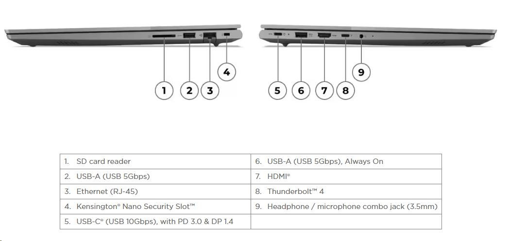 | Standartné porty | 1x USB-A (USB 5Gbps / USB 3.2 Gen 1) 1x USB-A (USB 5Gbps / USB 3.2 Gen 1), Always On 1x USB-C® (USB 10Gbps / USB 3.2 Gen 2), with USB PD 3.0 and DisplayPort™ 1.4 1x USB-C® (Thunderbolt™ 4 / USB4® 40Gbps), with USB PD 3.0 and DisplayPort™ 1.4 1x HDMI® 2.1, up to 4K/60Hz 1x Headphone / microphone combo jack (3.5mm) 1x Ethernet (RJ-45) 1x SD card reader |