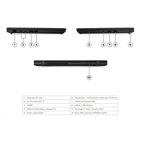 | Standartné porty | 1x USB-A (Hi-Speed USB / USB 2.0) 2x USB-A (USB 5Gbps / USB 3.2 Gen 1), one Always On 2x USB-C® (Thunderbolt™ 4 / USB4® 40Gbps), with USB PD 3.1 and DisplayPort™ 2.1 1x HDMI® 2.1, up to 4K/60Hz 1x Headphone / microphone combo jack (3.5mm) 1x Ethernet (RJ-45) |