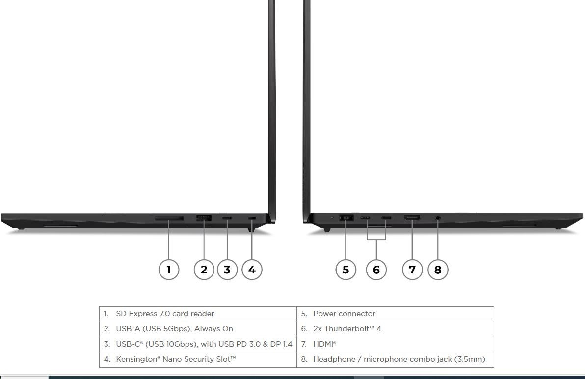 | Standartné porty | 1x USB-A (USB 5Gbps / USB 3.2 Gen 1), Always On 1x USB-C® (USB 10Gbps / USB 3.2 Gen 2), with USB PD 3.0 (135W input) and DisplayPort™ 1.4 2x USB-C® (Thunderbolt™ 4 / USB4® 40Gbps), with USB PD 3.0 (135W input) and DisplayPort™ 2.1 1x HDMI® 2.1, up to 8K/60Hz 1x Headphone / microphone combo jack (3.5mm) 1x SD Express 7.0 card reader 1x Security keyhole |
