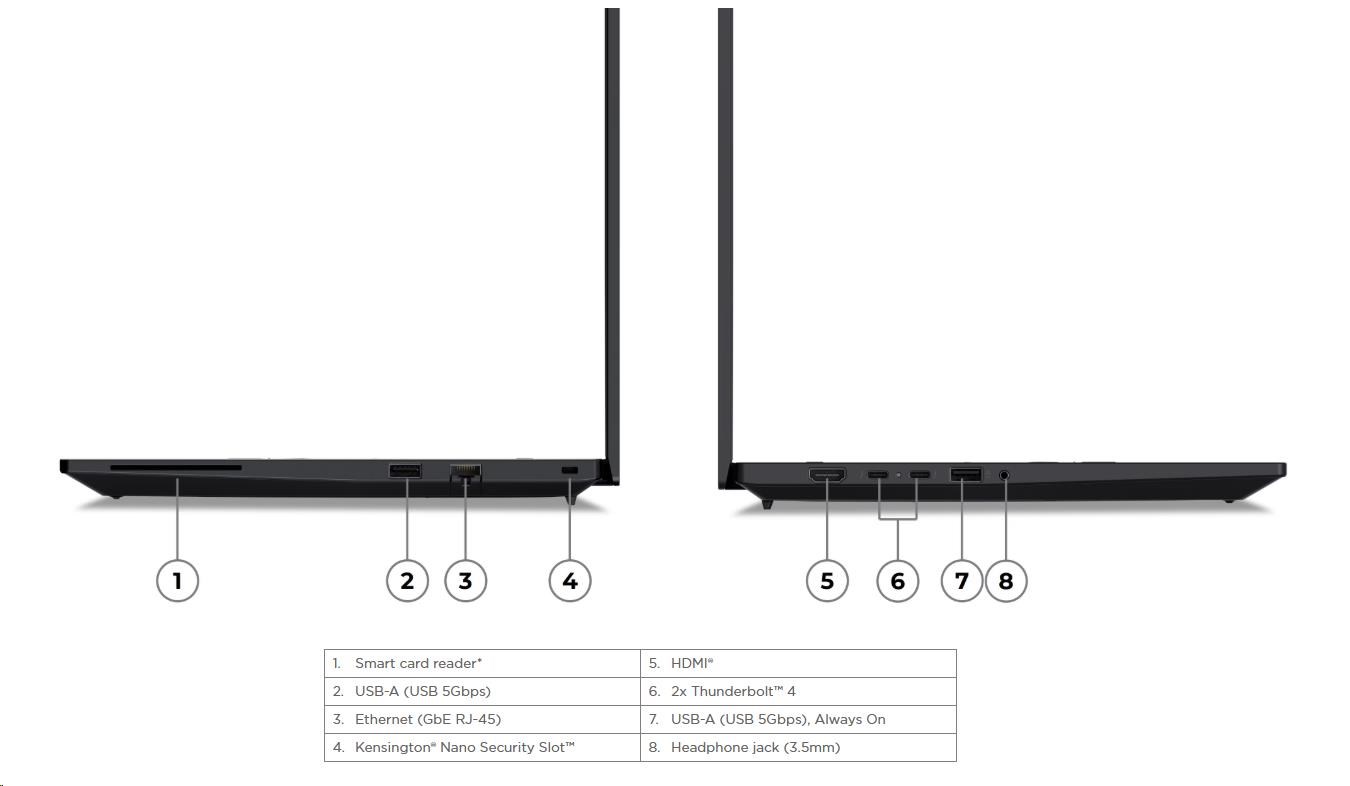 | Standartné porty | 1x USB-A (USB 5Gbps / USB 3.2 Gen 1) 1x USB-A (USB 5Gbps / USB 3.2 Gen 1), Always On 2x Thunderbolt™ 4, with USB PD 3.0 1x HDMI® 2.1, up to 4K/60Hz 1x Headphone / microphone combo jack (3.5mm) 1x Ethernet (GbE RJ-45) 1x Security keyhole 1x Smart Card Reader |
