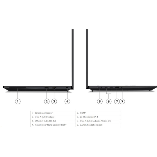 | Standartné porty | 1x USB-A (USB 5Gbps / USB 3.2 Gen 1) 1x USB-A (USB 5Gbps / USB 3.2 Gen 1), Always On 2x USB-C® (Thunderbolt™ 4 / USB4® 40Gbps), with USB PD 3.0 and DisplayPort™ 2.1 1x HDMI® 2.1, up to 4K/60Hz 1x Headphone / microphone combo jack (3.5mm) 1x Ethernet (RJ-45) 1x Security keyhole  |