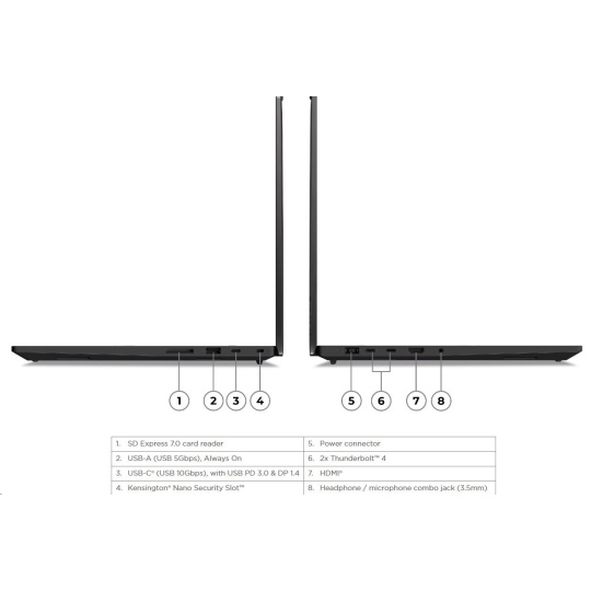 | Standartné porty | 1x USB-A (USB 5Gbps / USB 3.2 Gen 1), Always On 1x USB-C® (USB 10Gbps / USB 3.2 Gen 2), with USB PD 3.0 (135W input) and DisplayPort™ 1.4 2x USB-C® (Thunderbolt™ 4 / USB4® 40Gbps), with USB PD 3.0 (135W input) and DisplayPort™ 2.1 1x HDMI® 2.1, up to 8K/60Hz 1x Headphone / microphone combo jack (3.5mm) 1x SD Express 7.0 card reader 1x Security keyhole |