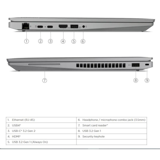 | Standartné porty | 2x USB 3.2 Gen 1 (one Always On) 1x USB-C® 3.2 Gen 2 (support data transfer, Power Delivery 3.0 and DisplayPort™ 1.4) 1x USB4® 40Gbps (support data transfer, Power Delivery 3.0 and DisplayPort™ 1.4) 1x HDMI® 2.1, up to 4K/60Hz 1x Ethernet (RJ-45) 1x Headphone / microphone combo jack (3.5mm) 1x Security keyhole |