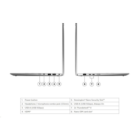 | Standartné porty | 1x USB-A (USB 5Gbps / USB 3.2 Gen 1) 1x USB-A (USB 5Gbps / USB 3.2 Gen 1), Always On 2x USB-C® (Thunderbolt™ 4 / USB4® 40Gbps), with USB PD 3.0 and DisplayPort™ 2.1 1x HDMI® 2.1, up to 4K/60Hz 1x Headphone / microphone combo jack (3.5mm) 1x Nano-SIM Card Slot |