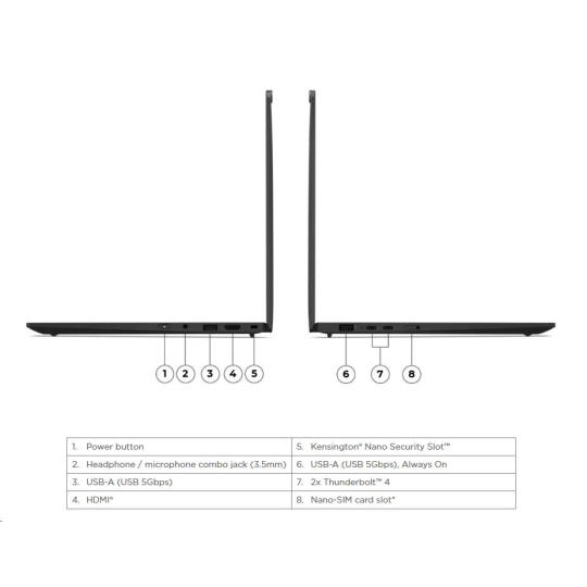 | Standartné porty | 1x USB-A (USB 5Gbps / USB 3.2 Gen 1) 1x USB-A (USB 5Gbps / USB 3.2 Gen 1), Always On 2x USB-C® (Thunderbolt™ 4 / USB4® 40Gbps), with USB PD 3.0 and DisplayPort™ 2.1 1x HDMI® 2.1, up to 4K/60Hz 1x Headphone / microphone combo jack (3.5mm) 1x Nano-SIM Card Slot  |