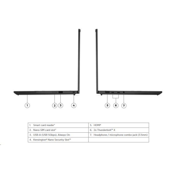 | Standartné porty | 1x USB-A (USB 5Gbps / USB 3.2 Gen 1), Always On 2x USB-C® (Thunderbolt™ 4 / USB4® 40Gbps), with USB PD 3.0 and DisplayPort™ 2.1 1x HDMI® 2.1, up to 4K/60Hz 1x Headphone / microphone combo jack (3.5mm)  |