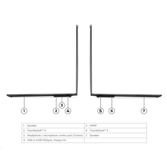 | Standartné porty | 1x USB-A (USB 10Gbps / USB 3.2 Gen 2), Always On 2x USB-C® (Thunderbolt™ 4 / USB4® 40Gbps), with USB PD 3.0 and DisplayPort™ 2.1 1x HDMI® 2.1, up to 4K/60Hz 1x Headphone / microphone combo jack (3.5mm) |