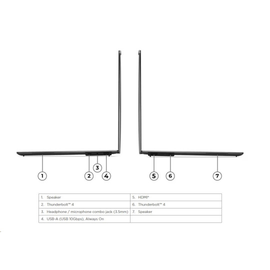 | Standartné porty | 1x USB-A (USB 10Gbps / USB 3.2 Gen 2), Always On 2x USB-C® (Thunderbolt™ 4 / USB4® 40Gbps), with USB PD 3.0 and DisplayPort™ 2.1 1x HDMI® 2.1, up to 4K/60Hz 1x Headphone / microphone combo jack (3.5mm) |