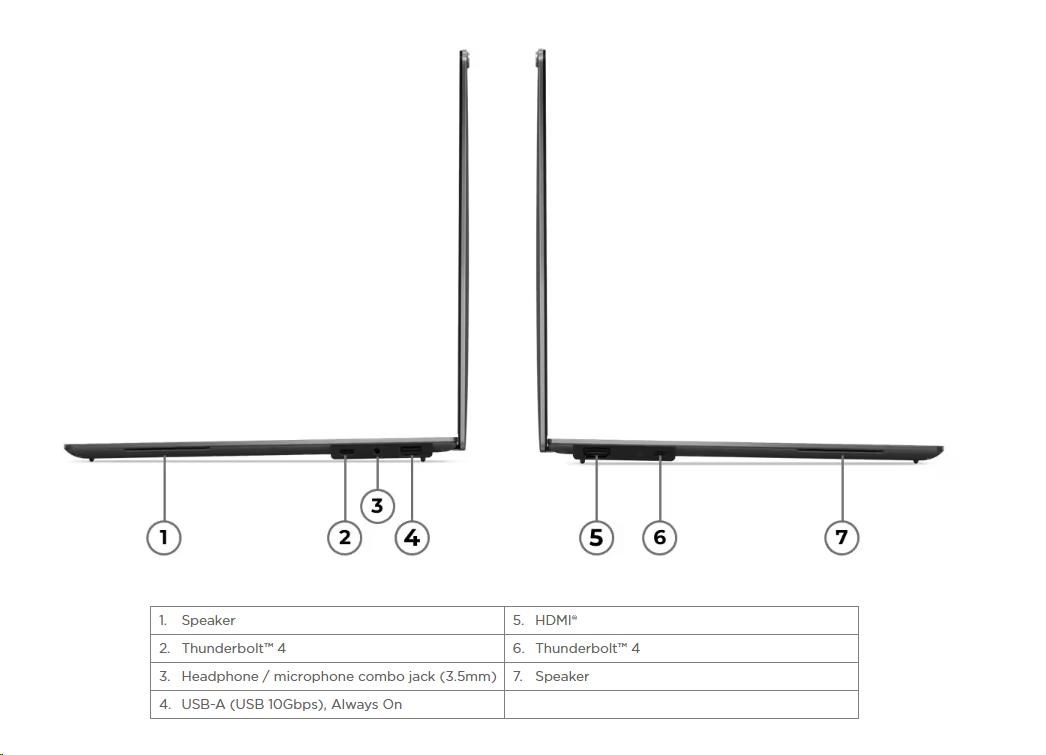 | Standartné porty | 1x USB-A (USB 10Gbps / USB 3.2 Gen 2), Always On 2x USB-C® (Thunderbolt™ 4 / USB4® 40Gbps), with USB PD 3.0 and DisplayPort™ 2.1 1x HDMI® 2.1, up to 4K/60Hz 1x Headphone / microphone combo jack (3.5mm) |