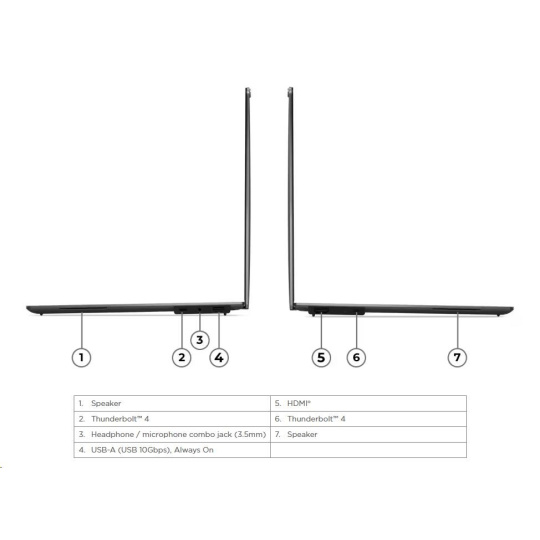 | Štandardné porty | 1x USB-A (USB 10Gbps / USB 3.2 Gen 2), Always On 2x USB-C® (Thunderbolt™ 4 / USB4® 40Gbps), s USB PD 3.0 a DisplayPort™ 2.1 1x HDMI® 2.1, až do 4K/60Hz 1x Zvukový / mikrofónový combo jack (3,5 mm) |