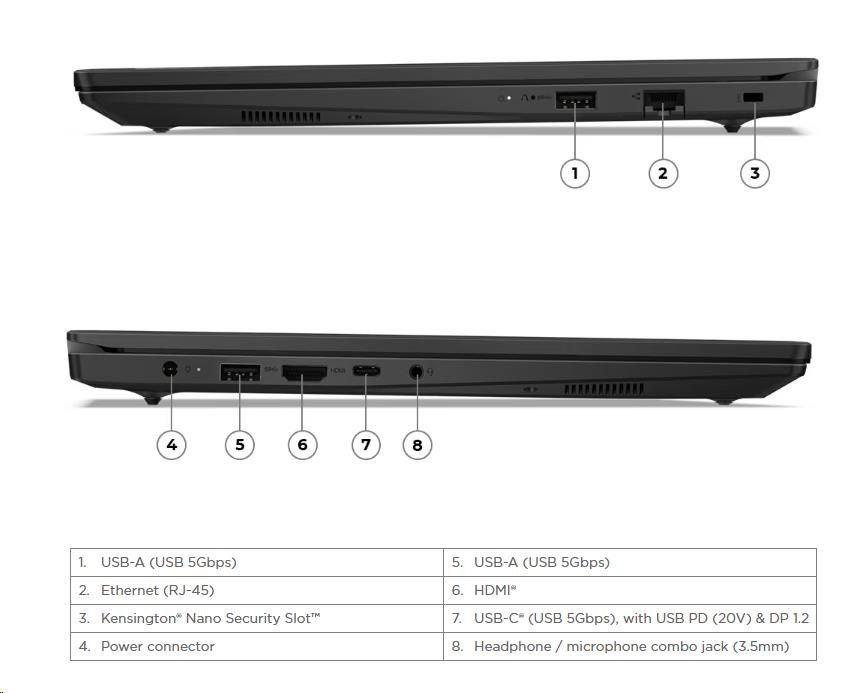 | Standardné porty | 2x USB-A (USB 5Gbps / USB 3.2 Gen 1) 1x USB-C® (USB 5Gbps / USB 3.2 Gen 1), s podporou USB Power Delivery (len 20V) a DisplayPort™ 1.2 1x HDMI® 1.4b 1x kombinovaný jack slúchadiel/mikrofónu (3,5 mm) 1x Ethernet (RJ-45) 1x napájací konektor |