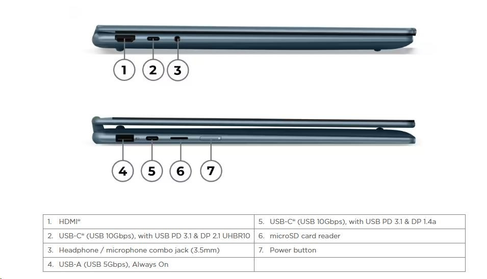| Standartné porty | 1x USB-A (USB 5Gbps / USB 3.2 Gen 1), Always On 1x USB-C® (USB 10Gbps / USB 3.2 Gen 2), with USB PD 3.1 and DisplayPort™ 2.1 UHBR10 1x USB-C® (USB 10Gbps / USB 3.2 Gen 2), with USB PD 3.1 and DisplayPort™ 1.4a 1x HDMI® 2.1, up to 4K/60Hz 1x Headphone / microphone combo jack (3.5mm) 1x microSD card reader |