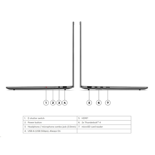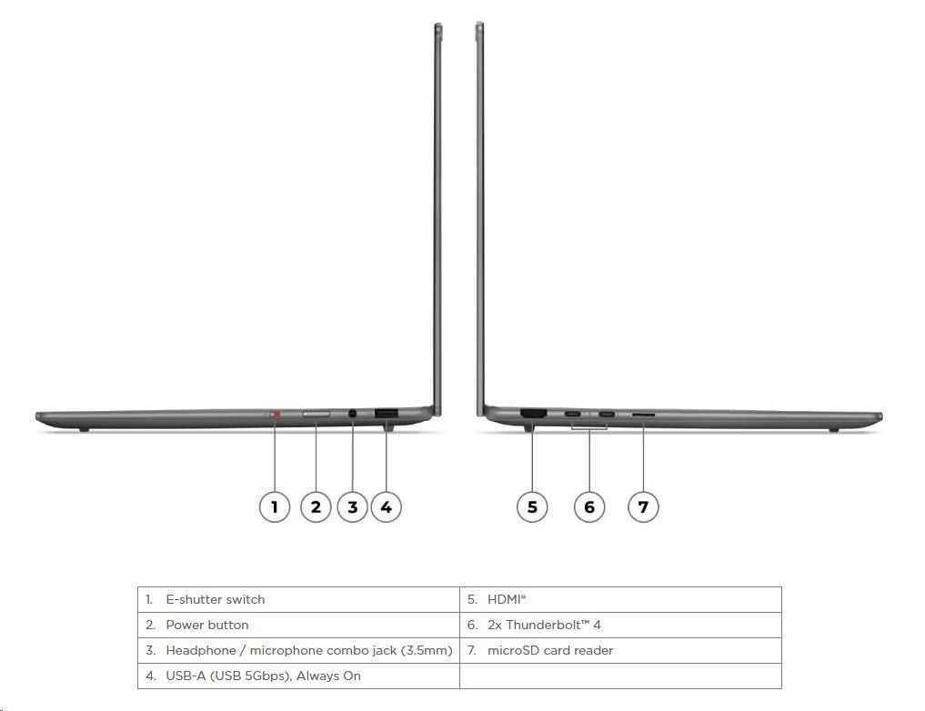 | Standartné porty | 1x USB-A (USB 5Gbps / USB 3.2 Gen 1), Always On 2x USB-C® (Thunderbolt™ 4 / USB4® 40Gbps), with USB PD 3.0 and DisplayPort™ 2.1 1x HDMI® 2.1, up to 4K/60Hz 1x Headphone / microphone combo jack (3.5mm) 1x microSD card reader |