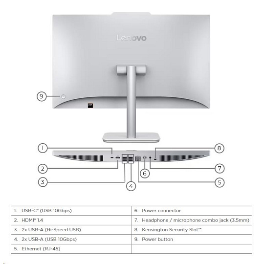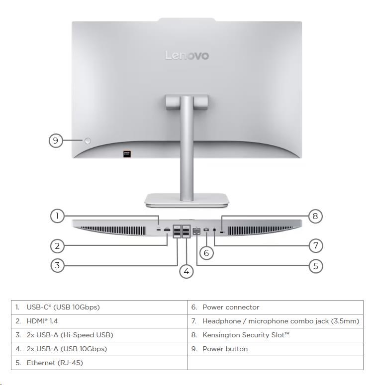 | Zadné porty | 1x USB-C® (USB 10Gbps / USB 3.2 Gen 2) 2x USB-A (Hi-Speed USB / USB 2.0) 2x USB-A (USB 10Gbps / USB 3.2 Gen 2) 1x HDMI® 1.4 1x Ethernet (RJ-45) 1x headphone / microphone combo jack (3.5mm) 1x power connector |