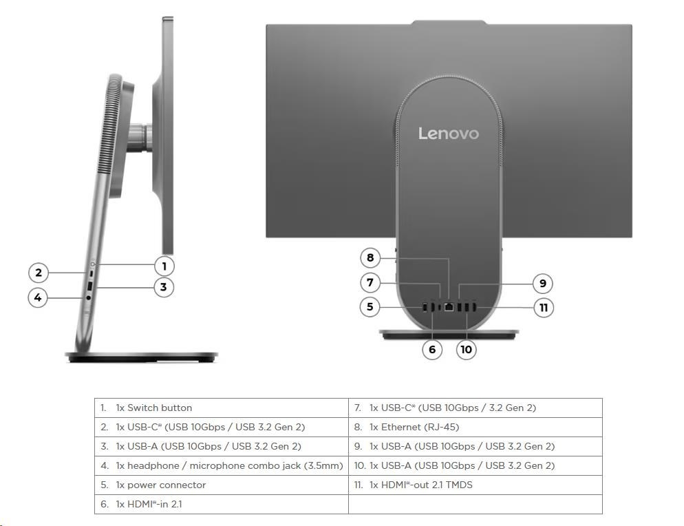 | Zadné porty | 1x USB-C® (USB 10Gbps / 3.2 Gen 2) 2x USB-A (USB 10Gbps / USB 3.2 Gen 2) 1x HDMI®-in 2.1 1x HDMI®-out 2.1 TMDS 1x Ethernet (RJ-45) 1x power connector |