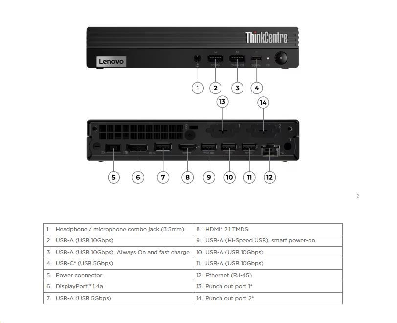 | Predné porty | 1x USB-C® (USB 5Gbps / USB 3.2 Gen 1), with 5V@0.9A charging 1x USB-A (USB 10Gbps / USB 3.2 Gen 2), with Always On and 5V@2.1A charging 1x USB-A (USB 10Gbps / USB 3.2 Gen 2) 1x headphone / microphone combo jack (3.5mm) |