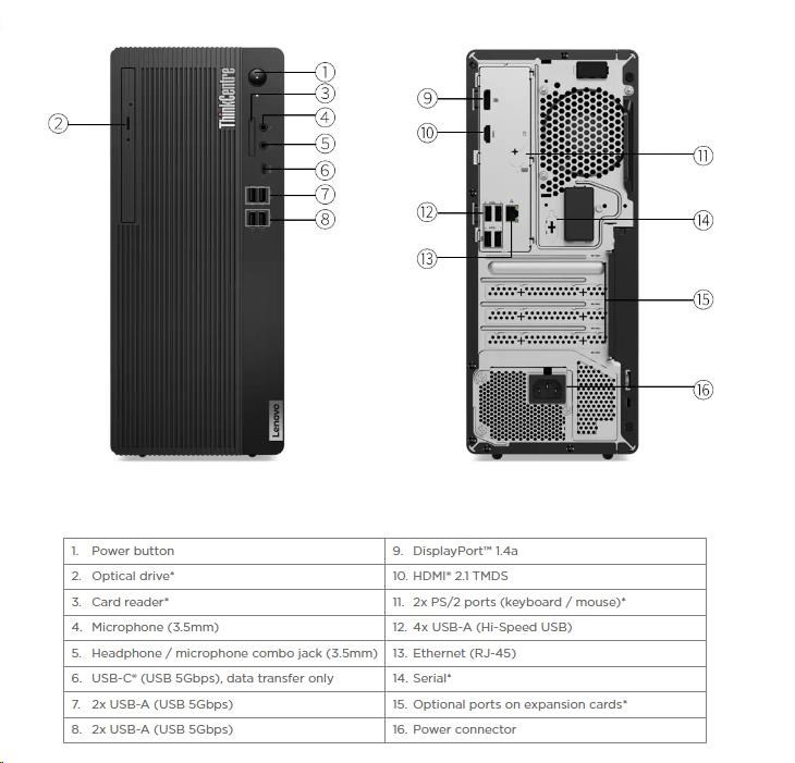 Predné porty | 1x USB-C® (USB 5Gbps / USB 3.2 Gen 1), with 15W charging 4x USB-A (USB 5Gbps / USB 3.2 Gen 1) 1x headphone / microphone combo jack (3.5mm) 1x microphone (3.5mm) |