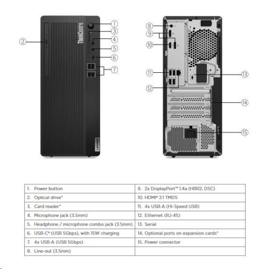 | Predné porty | 1x USB-C® (USB 5Gbps / USB 3.2 Gen 1), with 15W charging 4x USB-A (USB 5Gbps / USB 3.2 Gen 1) 1x headphone / microphone combo jack (3.5mm) 1x microphone (3.5mm)  |