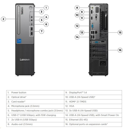 | Predné porty | 1x USB-C® (USB 5Gbps / USB 3.2 Gen 1), with 15W charging 2x USB-A (USB 5Gbps / USB 3.2 Gen 1) 1x headphone / microphone combo jack (3.5mm) 1x microphone (3.5mm) |