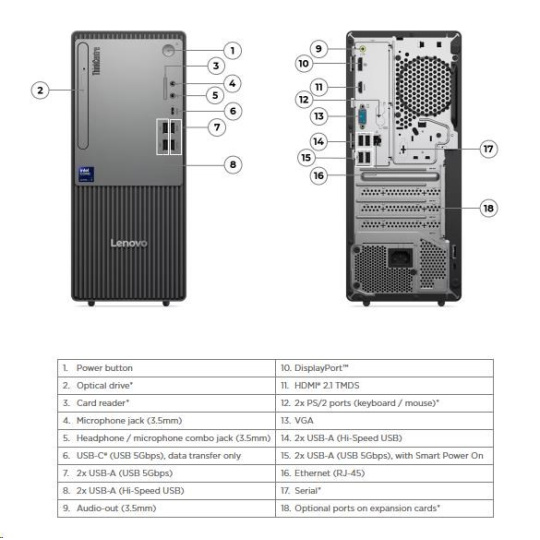 | Zadné porty | 2x USB-A (Hi-Speed USB / USB 2.0) 2x USB-A (USB 5Gbps / USB 3.2 Gen 1), one supports Smart Power On 1x HDMI® 2.1 TMDS 1x DisplayPort™ 1.4 1x VGA 1x Ethernet (RJ-45) 1x line-out (3.5mm) Optional Rear Ports (configured) |