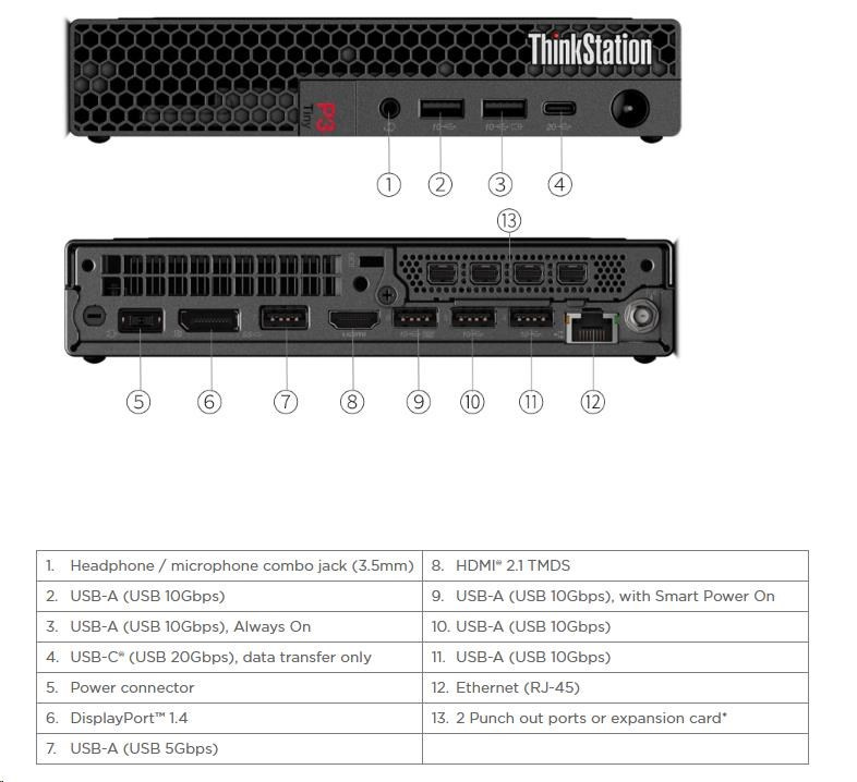 | Predné porty | 1x USB-C® (USB 20Gbps / USB 3.2 Gen 2x2), data transfer only 1x USB-A (USB 10Gbps / USB 3.2 Gen 2), Always On 1x USB-A (USB 10Gbps / USB 3.2 Gen 2) 1x headphone / microphone combo jack (3.5mm) |