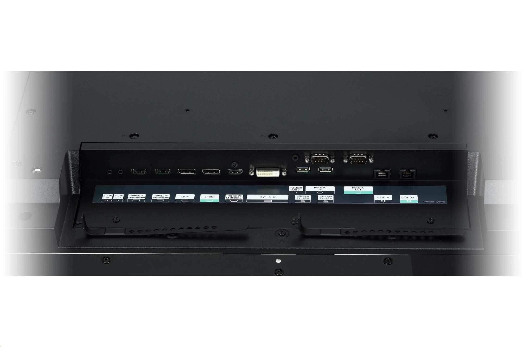 Brightness(Typ.) : 500 cd/m2 Pomery pomeru strán: 58:9 Okraj: 4.4 mm (L/R), 5.9 mm (T/B) Hĺbka: 81,7 mm Rozhranie: HDMI (3), DP, USB (2), Audio, DVI-D, RS232C, RJ45, IR