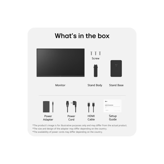 - Základňa stojanu 2. Skrutky 3. Napájací adaptér 4. Napájací kábel 5. Kábel HDMI 6. Sprievodca Nastavením
