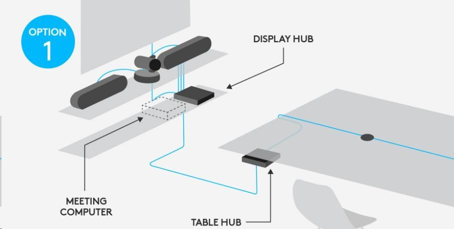 | Káble/napájanie | Kamera > Video Hub Počítač v konferenčnej miestnosti > video/desktop hub Video rozbočovač > Stolný rozbočovač Video Hub > Reproduktor (x2) Počítač v konferenčnej miestnosti > obrazovka (x2) Stolný mikrofón Zásuvka > napájací zdroj (x2) napájací zdroj > rozbočovač video/desktop (x2) |