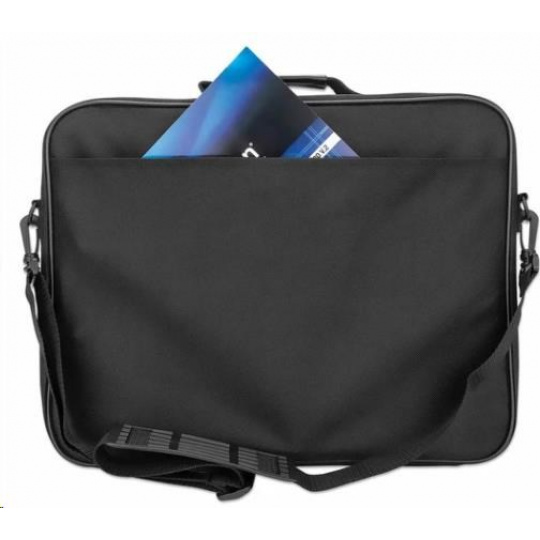 Plné otváranie, vhodné pre väčšinu notebookov do 15 rokov.6", dostatočne polstrovaná priehradka na notebook, predné, zadné a vnútorné vrecká, ramenný popruh, rukoväť, čierna farba